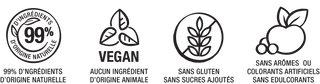 99% d'ingrédients d'origine naturelle • Sans sucres ajoutés • 100% Vegan • Sans gélatine animale • Sans OGM • Sans gluten • Sans édulcorants • Sans arômes ou colorants artificiels